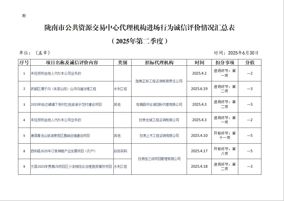 隴南市公共資源交易中心關(guān)于2025年第二季度代理機(jī)構(gòu)進(jìn)場(chǎng)行為誠(chéng)信評(píng)價(jià)結(jié)果的公示