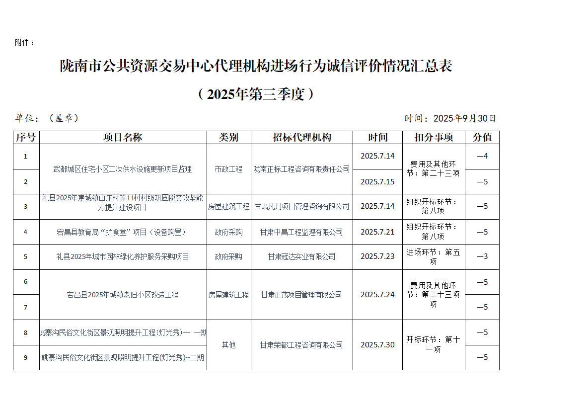 隴南市公共資源交易中心關(guān)于2025年第三季度代理機(jī)構(gòu)進(jìn)場(chǎng)行為誠(chéng)信評(píng)價(jià)結(jié)果的公示