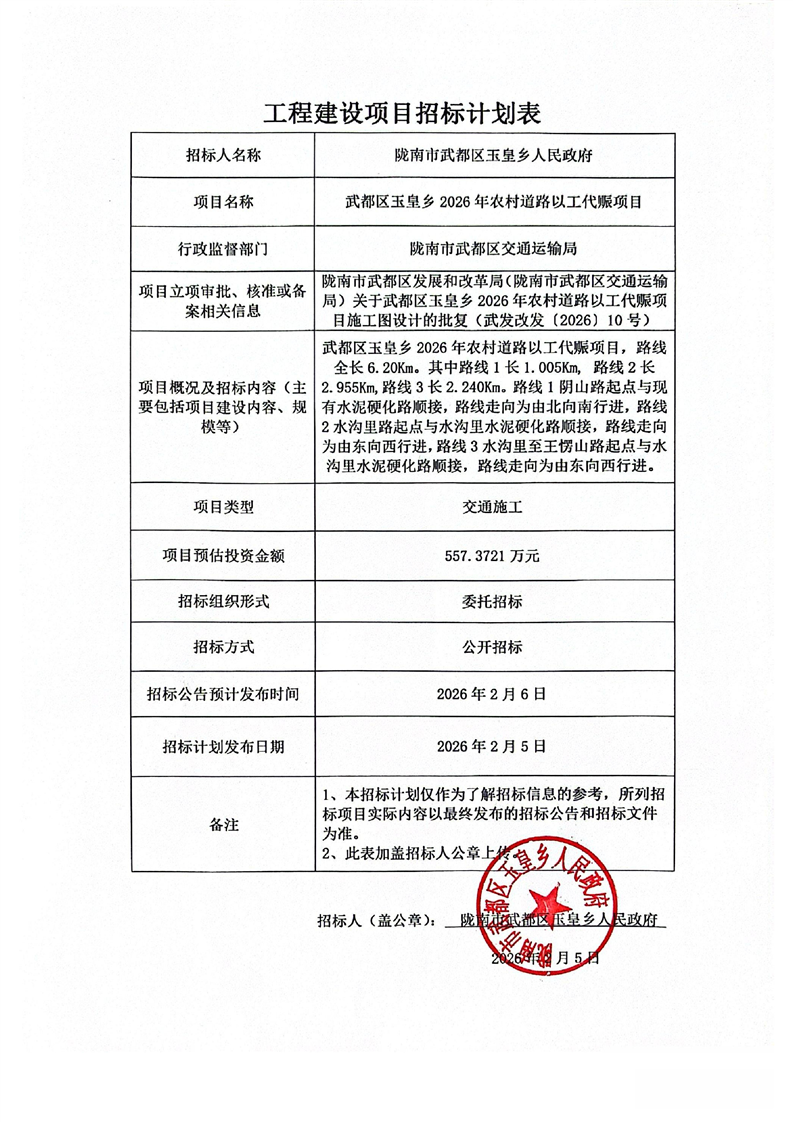 武都區(qū)玉皇鄉(xiāng)2026年農村道路以工代賑項目