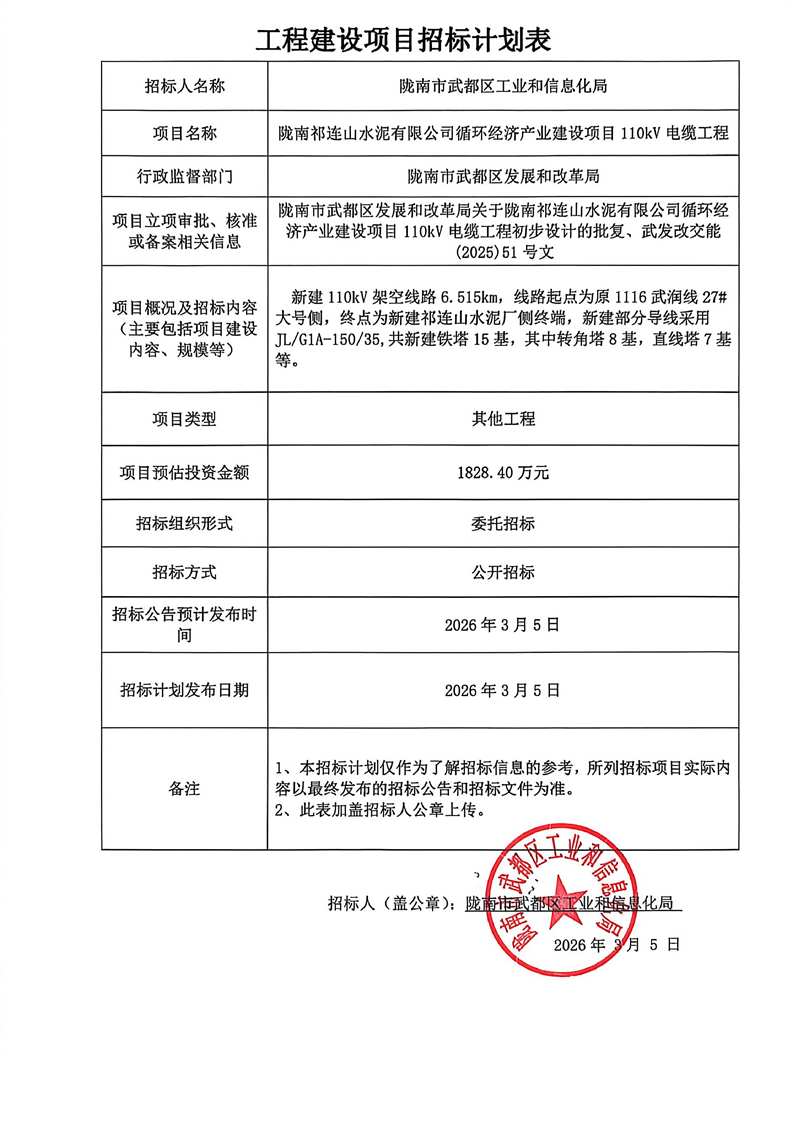 隴南祁連山水泥有限公司循環(huán)經(jīng)濟(jì)產(chǎn)業(yè)建設(shè)項(xiàng)目110kV電纜工程