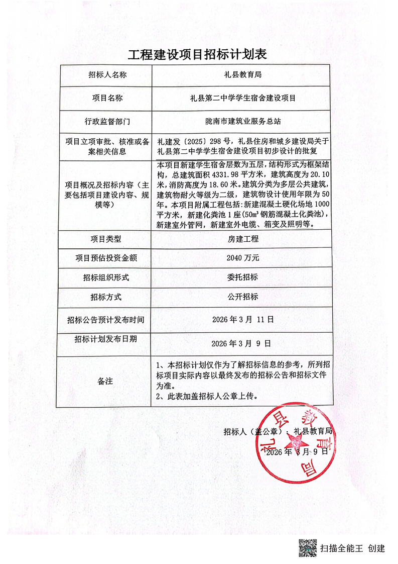 禮縣第二中學(xué)學(xué)生宿舍建設(shè)項(xiàng)目