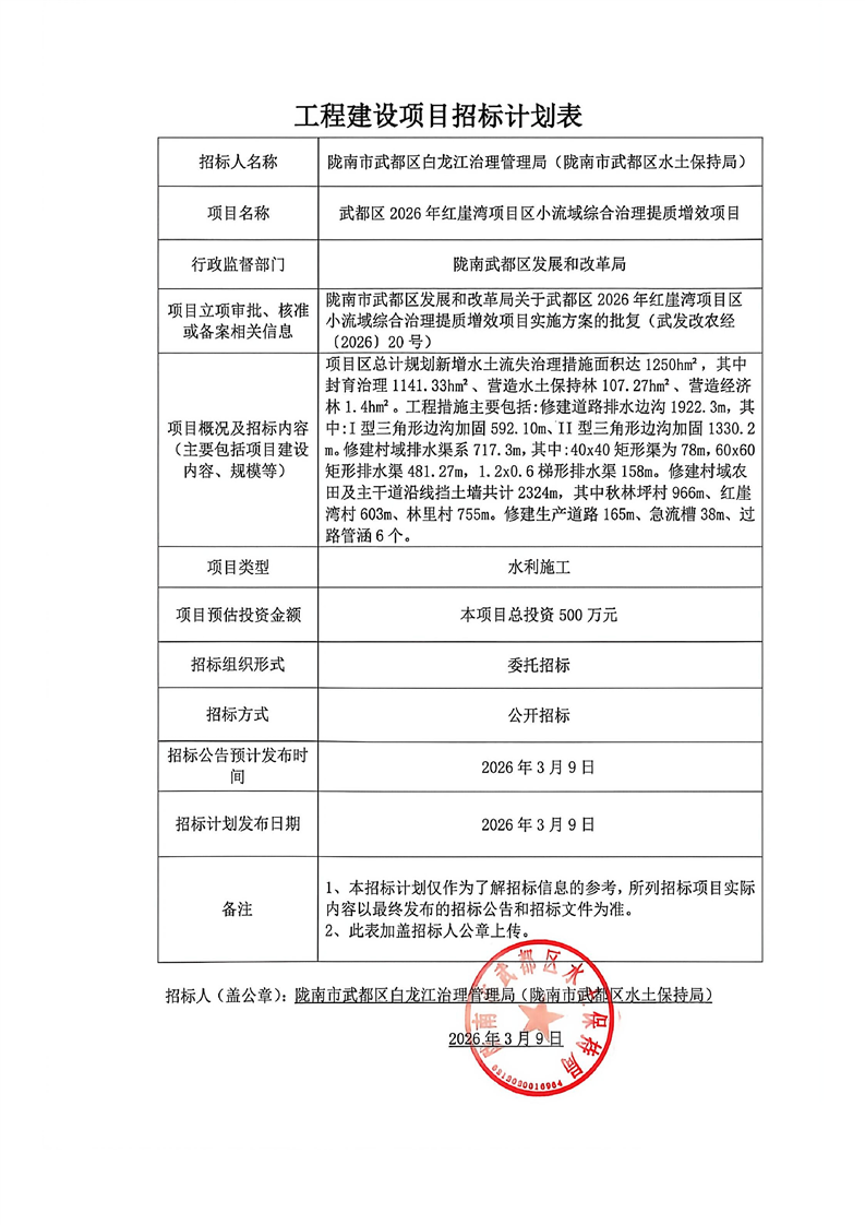 武都區(qū)2026年紅崖灣項(xiàng)目區(qū)小流域綜合治理提質(zhì)增效項(xiàng)目