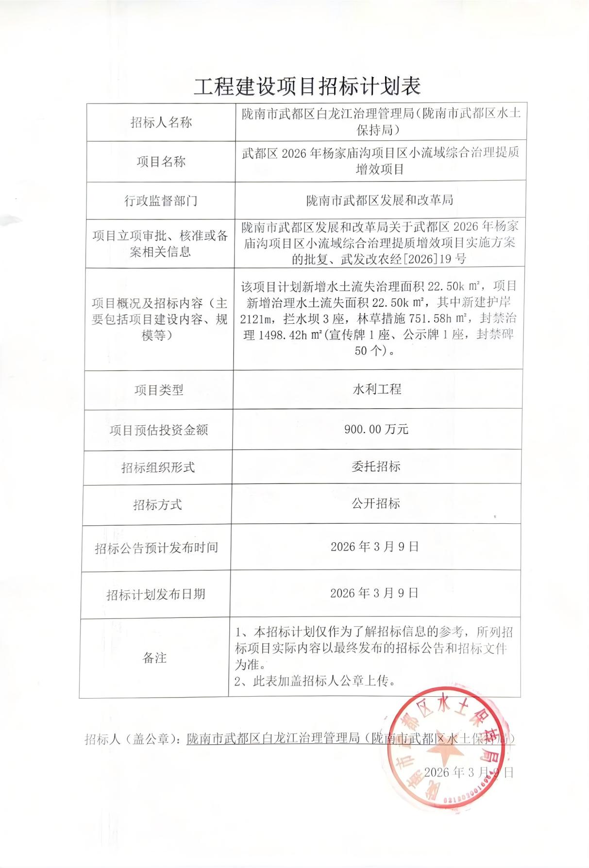 武都區(qū)2026年楊家廟溝項目區(qū)小流域綜合治理提質(zhì)增效項目