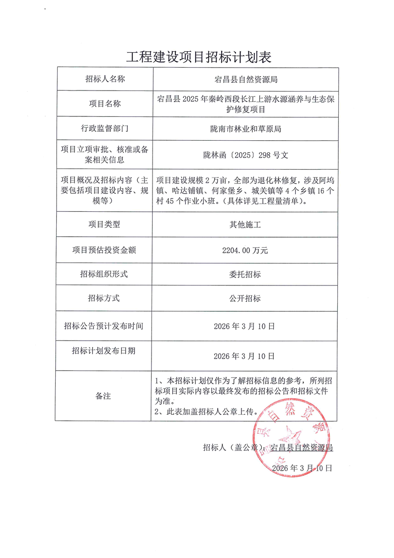 宕昌縣2025年秦嶺西段長江上游水源涵養(yǎng)與生態(tài)保護(hù)修復(fù)項目