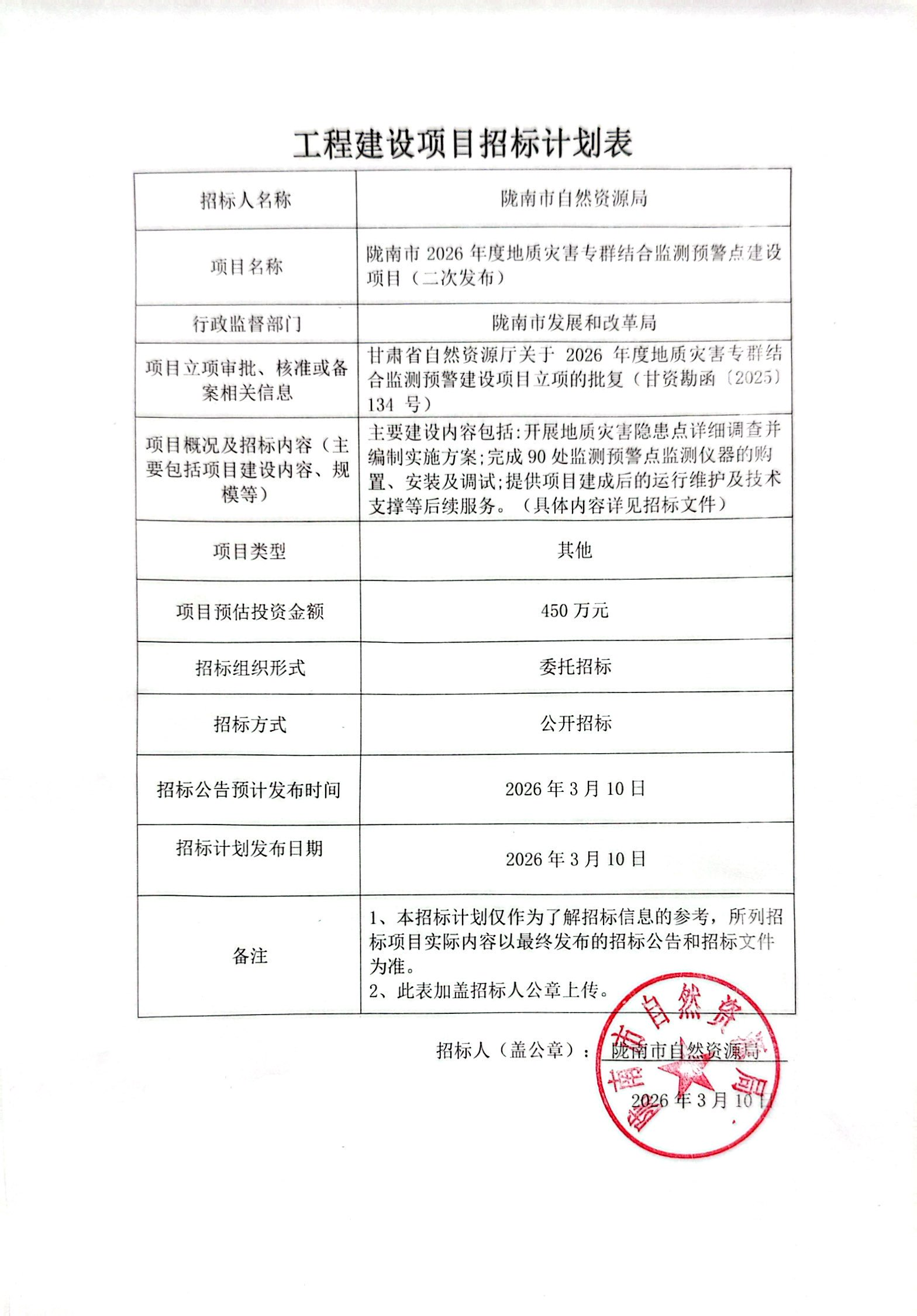 隴南市2026年度地質災害專群結合監(jiān)測預警點建設項目(二次發(fā)布)