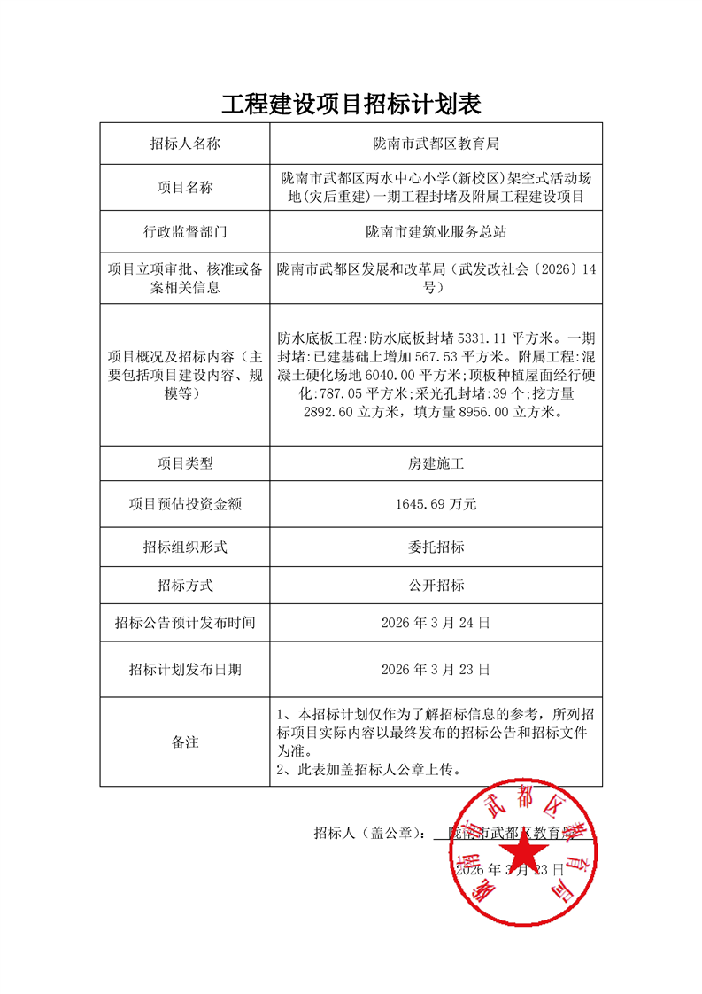 隴南市武都區(qū)兩水中心小學(xué)(新校區(qū))架空式活動場地(災(zāi)后重建)一期工程封堵及附屬工程建設(shè)項(xiàng)目