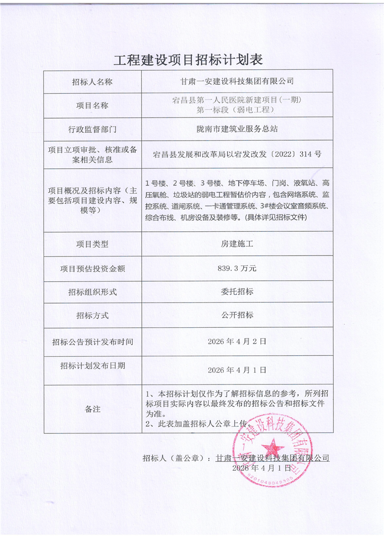 宕昌縣第一人民醫(yī)院新建項(xiàng)目(一期)第一標(biāo)段(弱電工程)