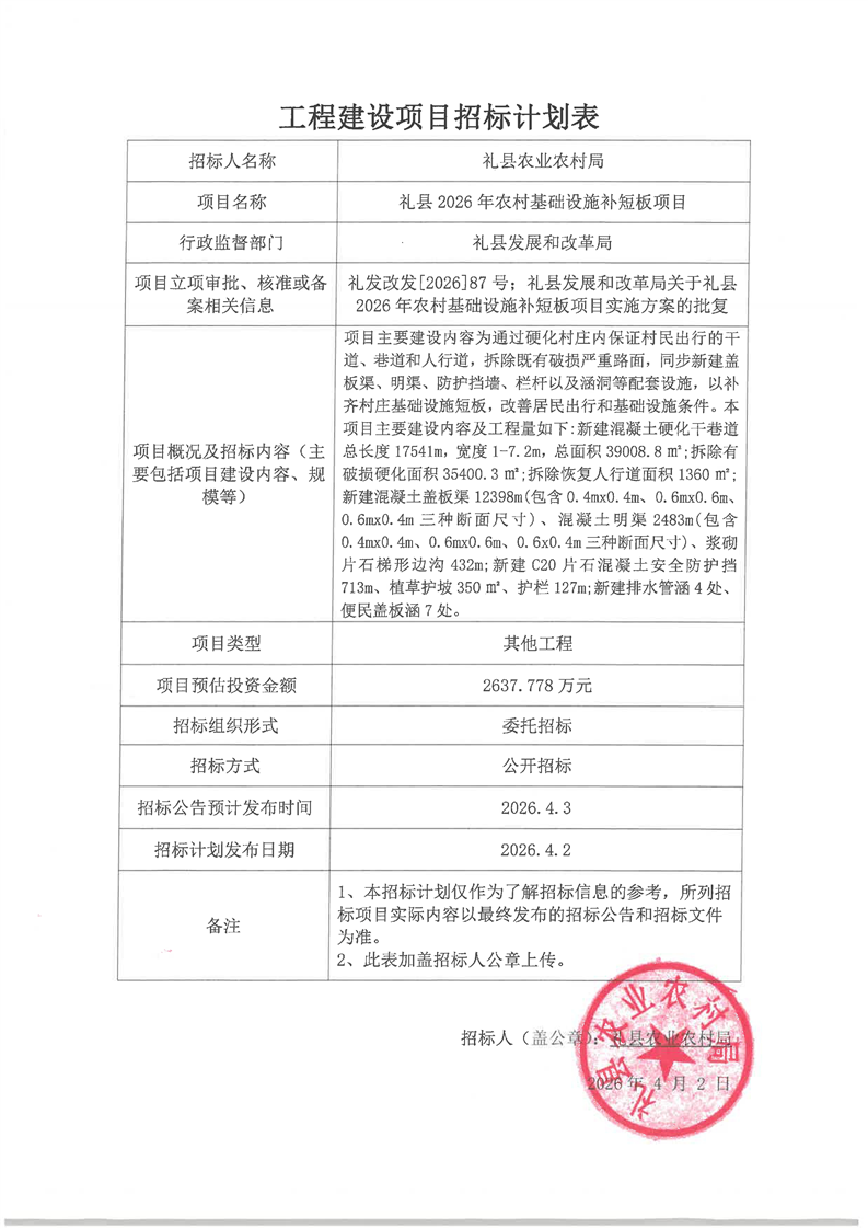 禮縣2026年農(nóng)村基礎(chǔ)設(shè)施補(bǔ)短板項(xiàng)目
