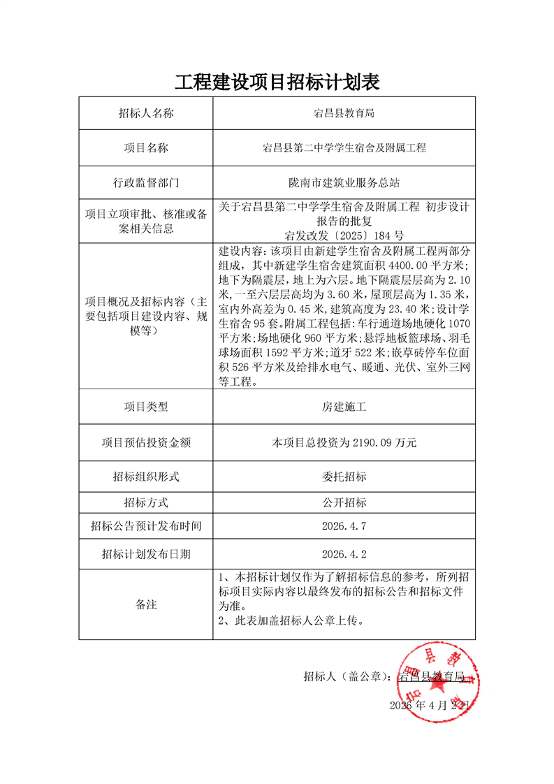 宕昌縣第二中學(xué)學(xué)生宿舍及附屬工程【工程建設(shè)項目招標(biāo)計劃表】.pdf