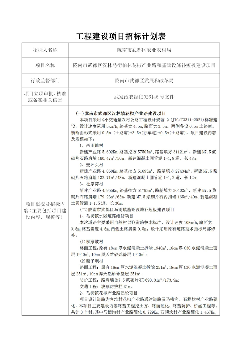隴南市武都區(qū)漢林馬街柏林花椒產(chǎn)業(yè)路和基礎(chǔ)設(shè)施補(bǔ)短板建設(shè)項(xiàng)目
