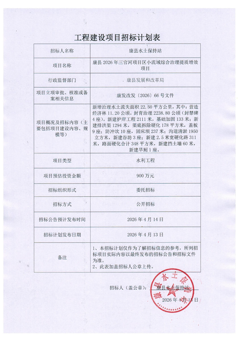 康縣2026年三官河項目區(qū)小流域綜合治理提質(zhì)增效項目