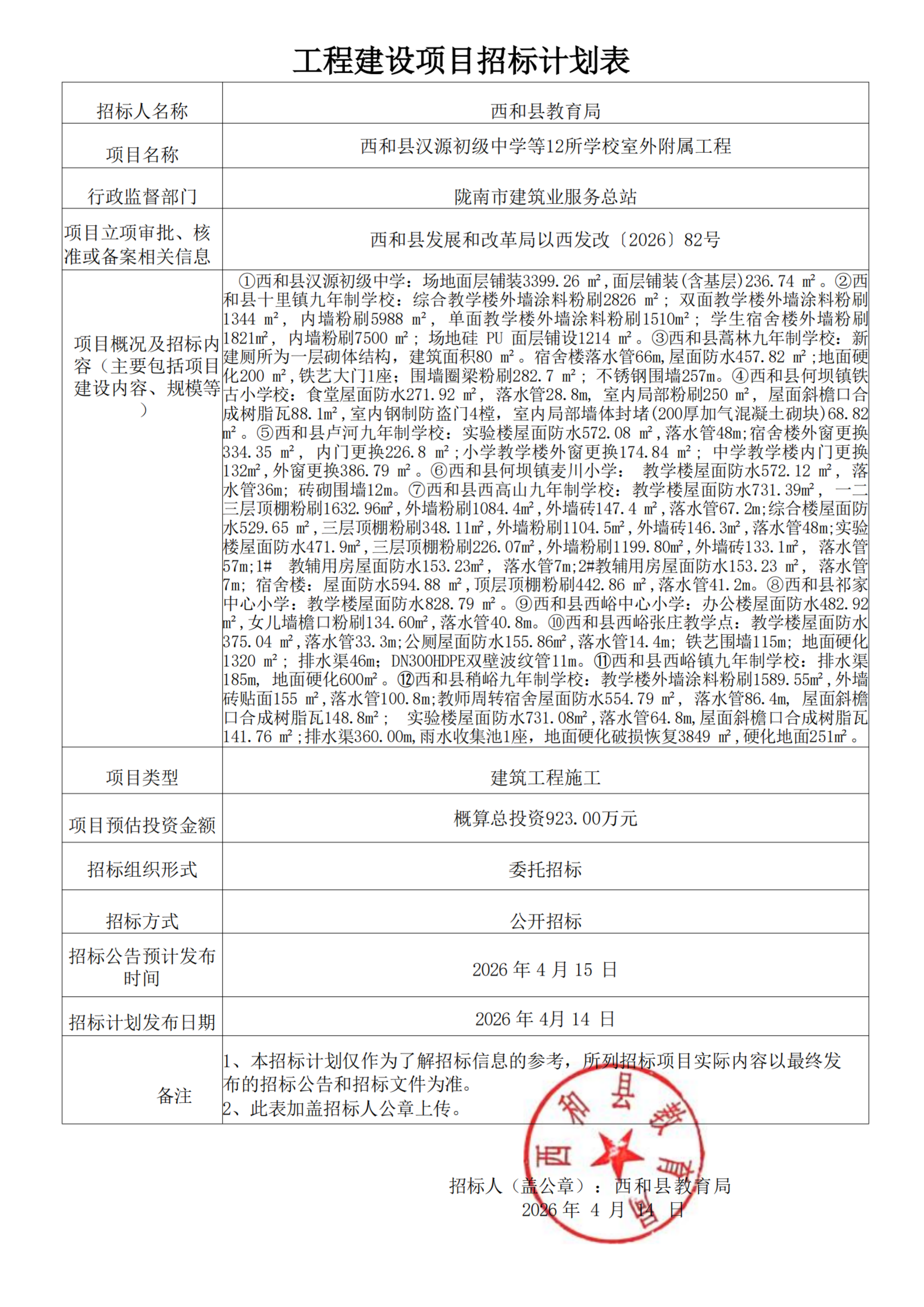 西和縣漢源初級中學(xué)等12所學(xué)校室外附屬工程