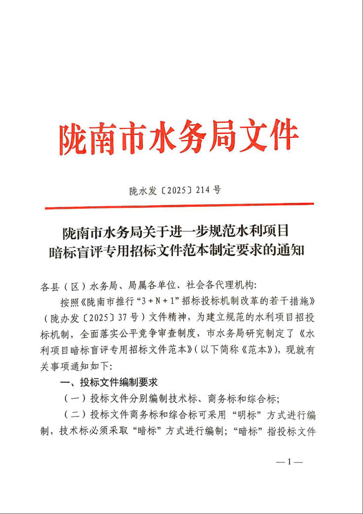 隴南市水務(wù)局關(guān)于進(jìn)一步規(guī)范水利項目暗標(biāo)盲評專用招標(biāo)文件范本制定要求的通知